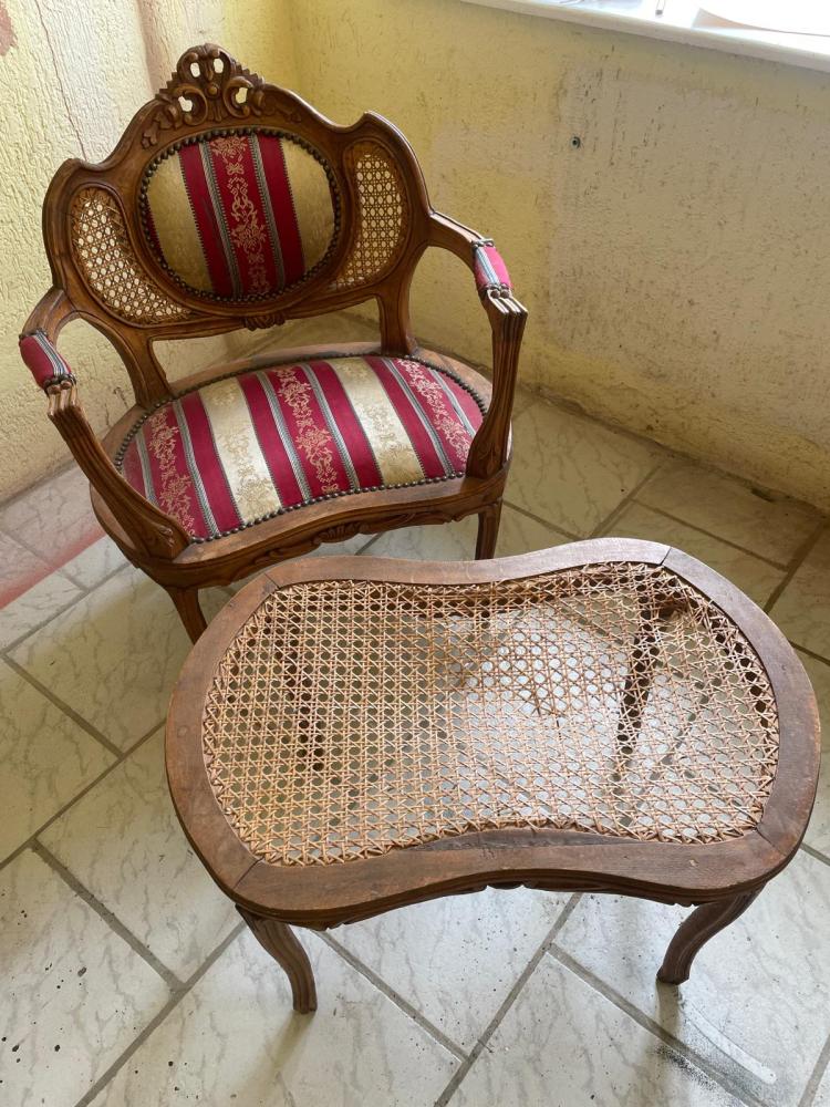 Das Holz vom Beistelltisch wurde ebenso liebevoll wieder aufgearbeitet und das Wiener Geflecht erneuert.