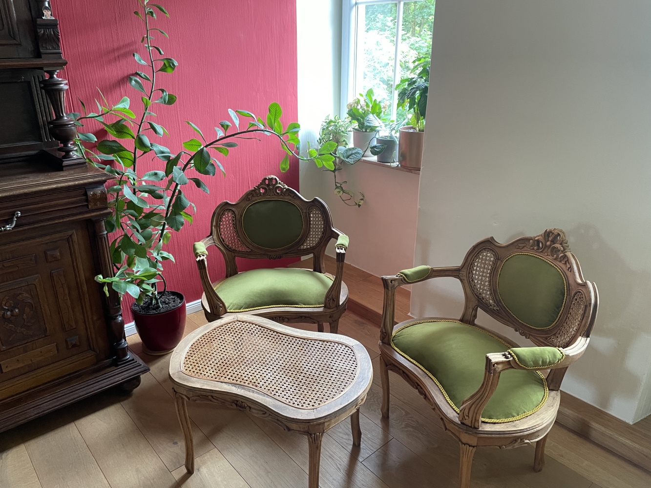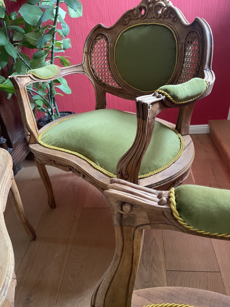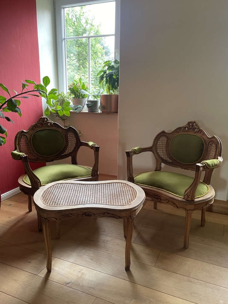 Diese Sitzgruppe bestehend aus zwei Armlehnenstühlen und einem Beistelltisch wurden im Rahmen einer aufwendigen Auftragsarbeit von Grund auf überarbeitet.