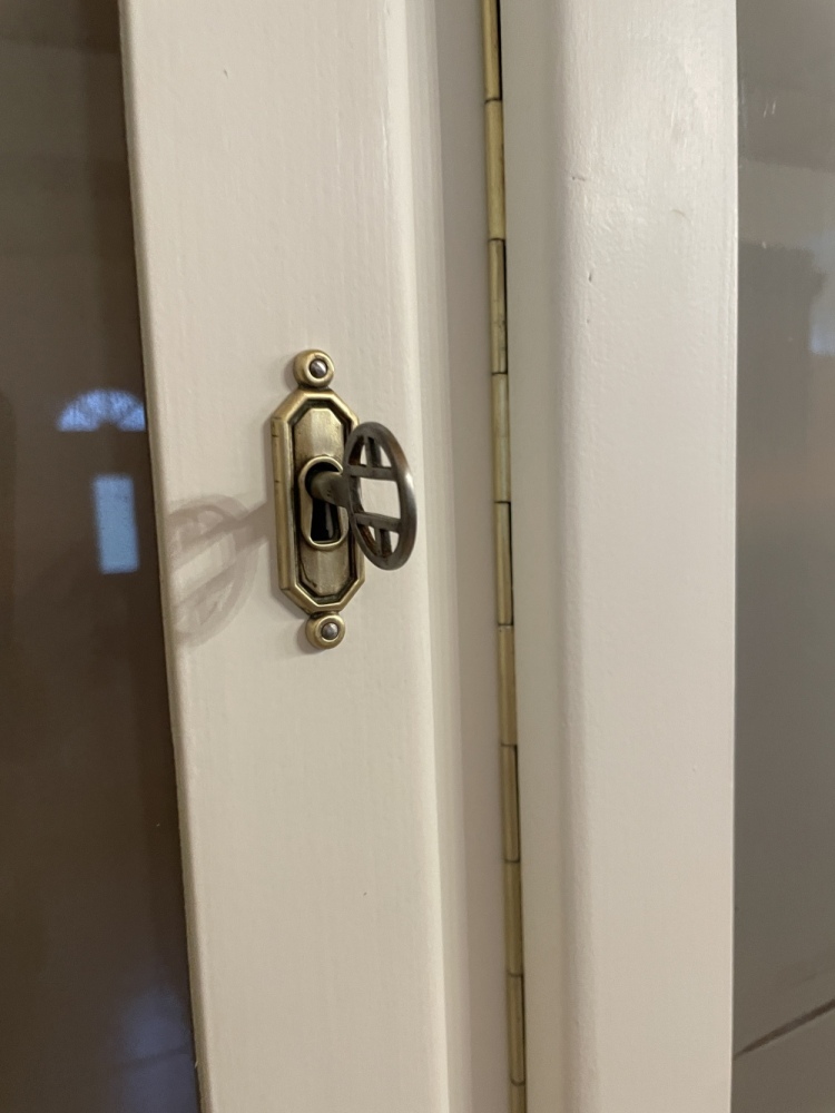 • Die originalen Beschläge wurden gereinigt, poliert und versiegelt – sie unterstreichen den antiken Charakter des Schranks.