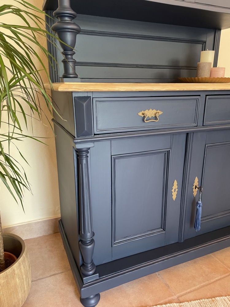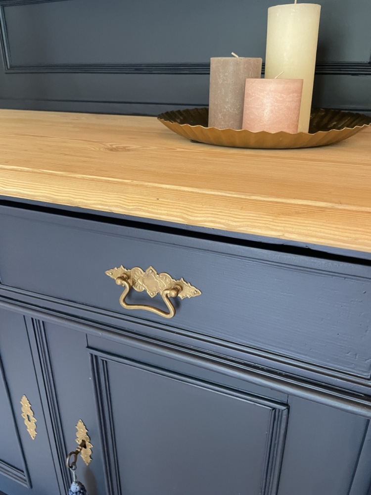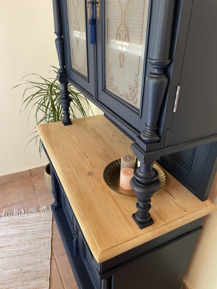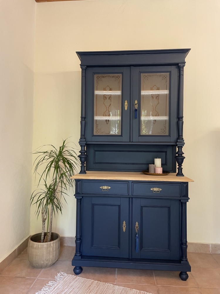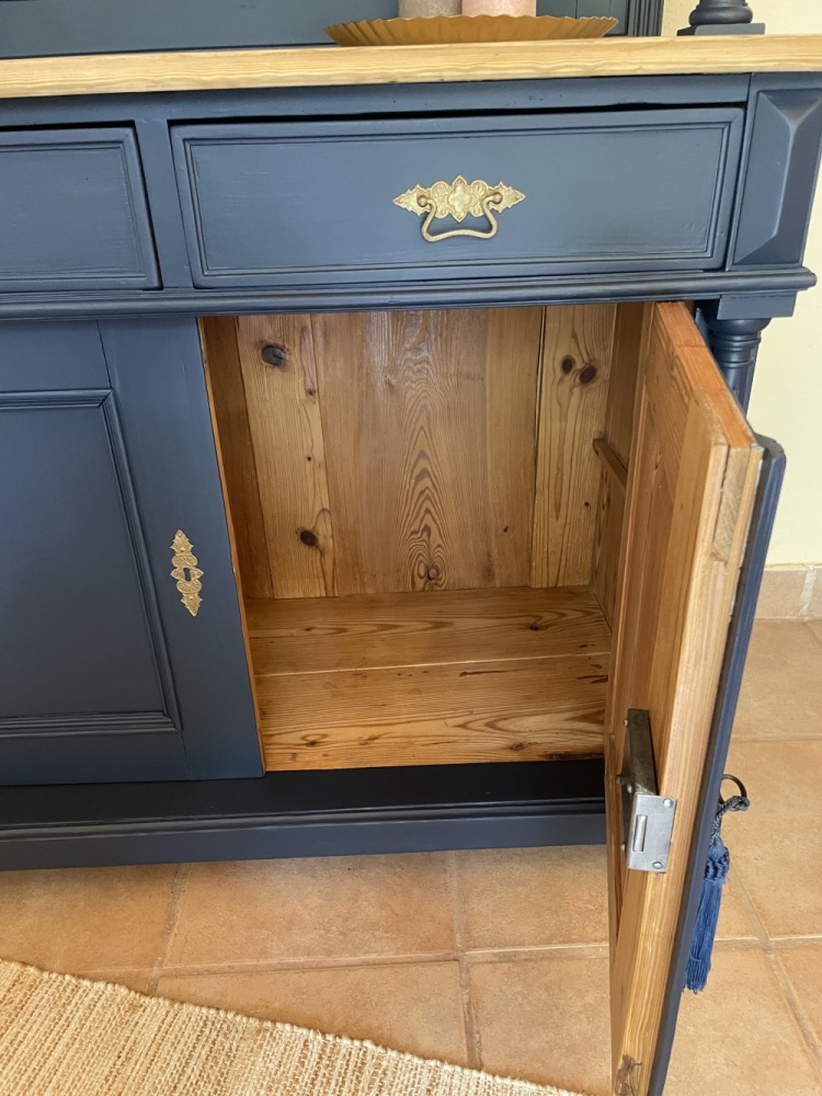 Ursprünglich naturfarben, erhielt das Möbelstück durch die Neugestaltung eine völlig neue Ausstrahlung. Der Korpus wurde mit der Farbe „Blau mit Tinte“ von Miss Pompadour gestrichen – ein tiefes, elegantes Blau, das die klassische Form des Buffets unterstreicht und ihm gleichzeitig eine moderne Ruhe verleiht.