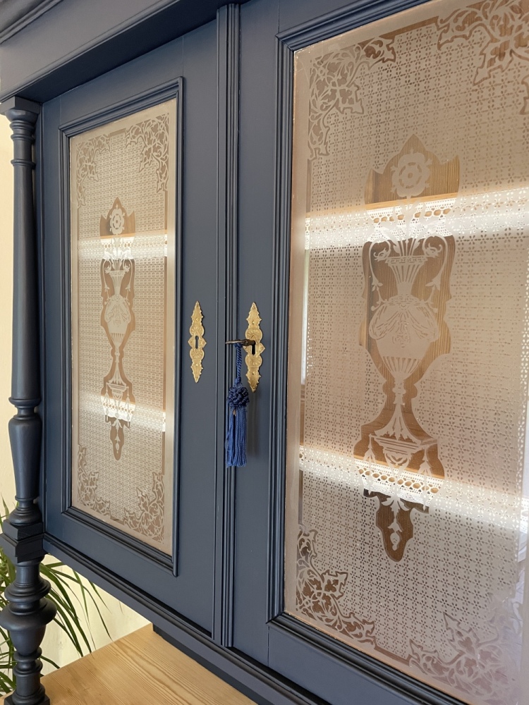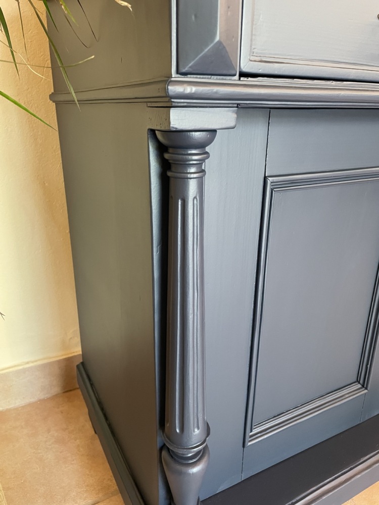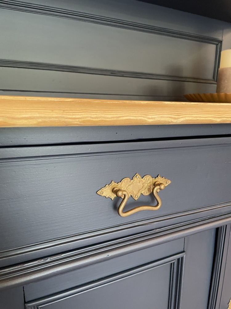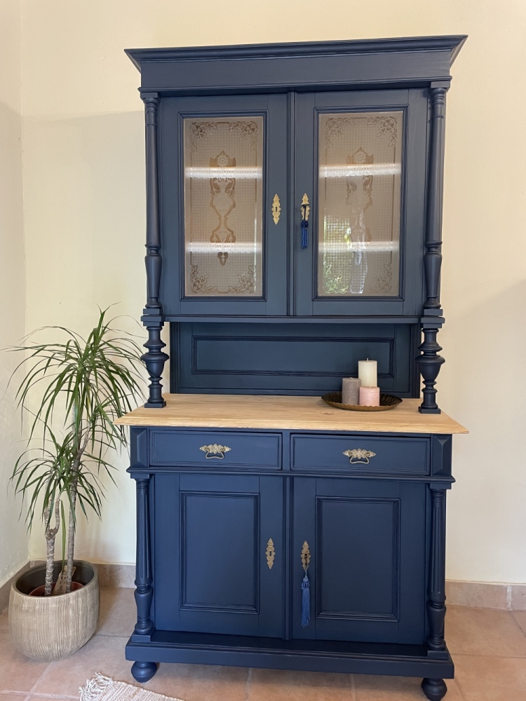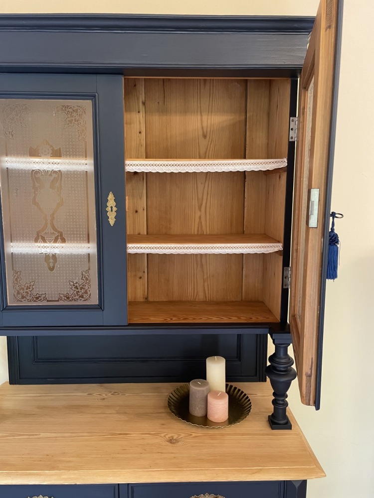 Ursprünglich naturfarben, erhielt das Möbelstück durch die Neugestaltung eine völlig neue Ausstrahlung. Der Korpus wurde mit der Farbe „Blau mit Tinte“ von Miss Pompadour gestrichen – ein tiefes, elegantes Blau, das die klassische Form des Buffets unterstreicht und ihm gleichzeitig eine moderne Ruhe verleiht.