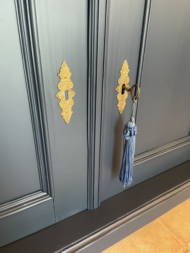 Maße: H: 143,5 cm, B: 98 cm, T: 47 cm Farbe: Blau mit Tinte (Miss Pompadour) Material: Massivholz, Messingbeschläge