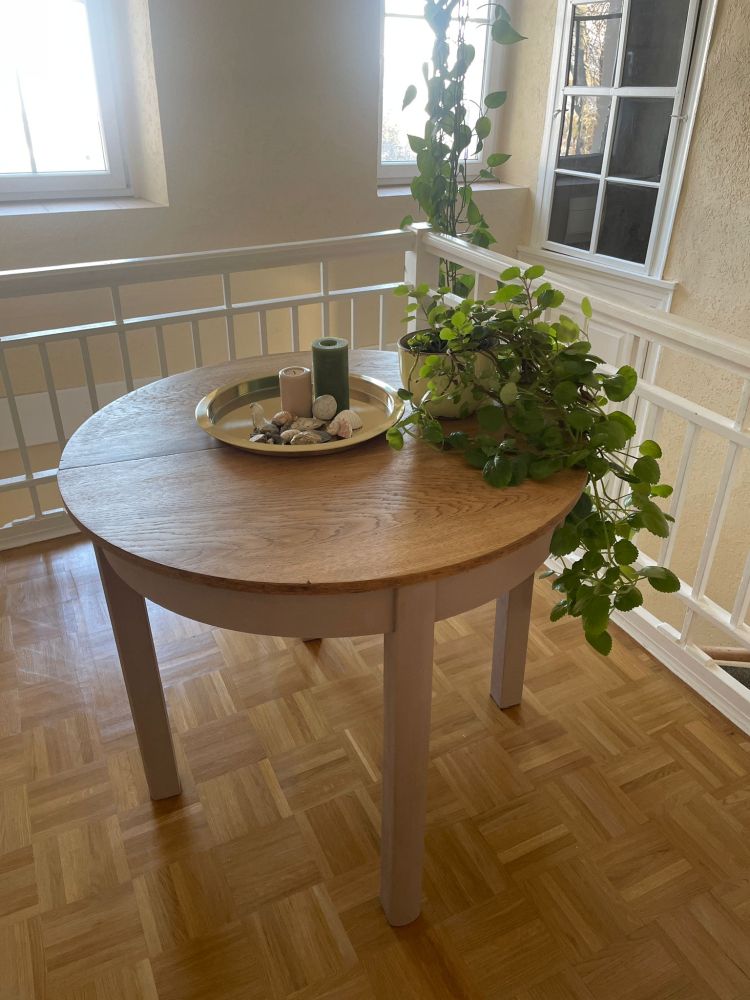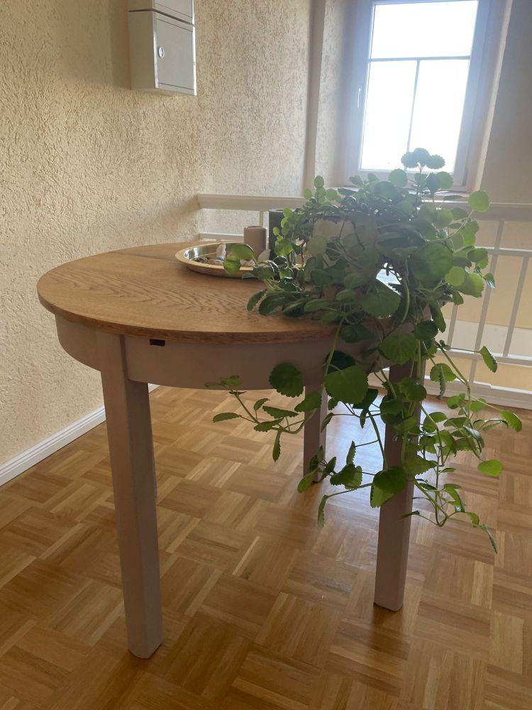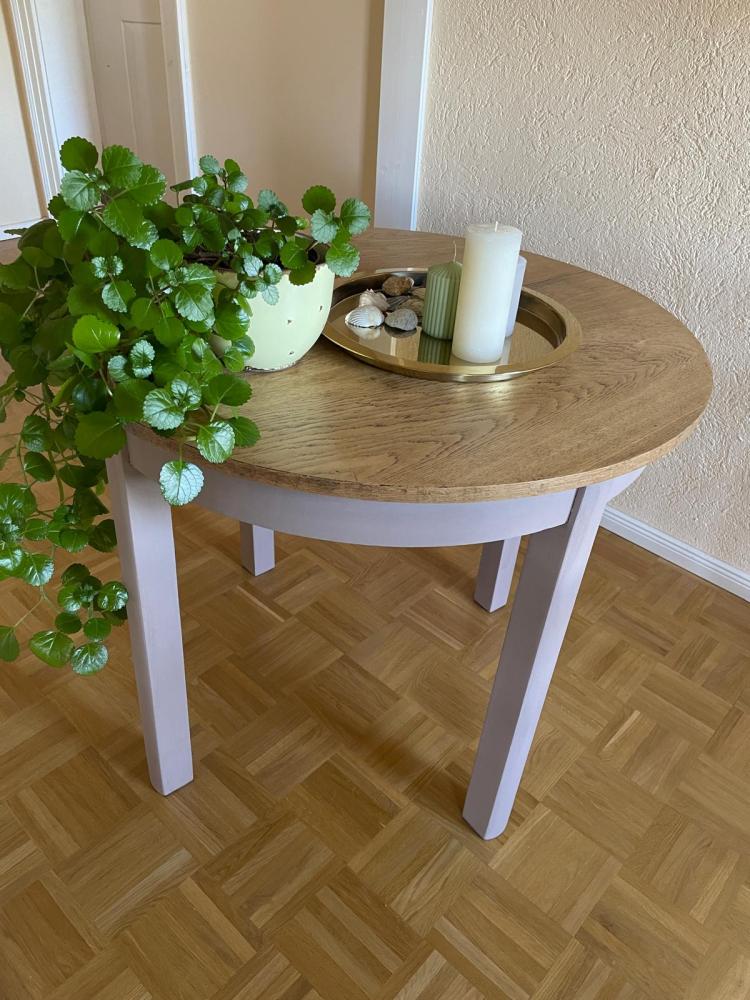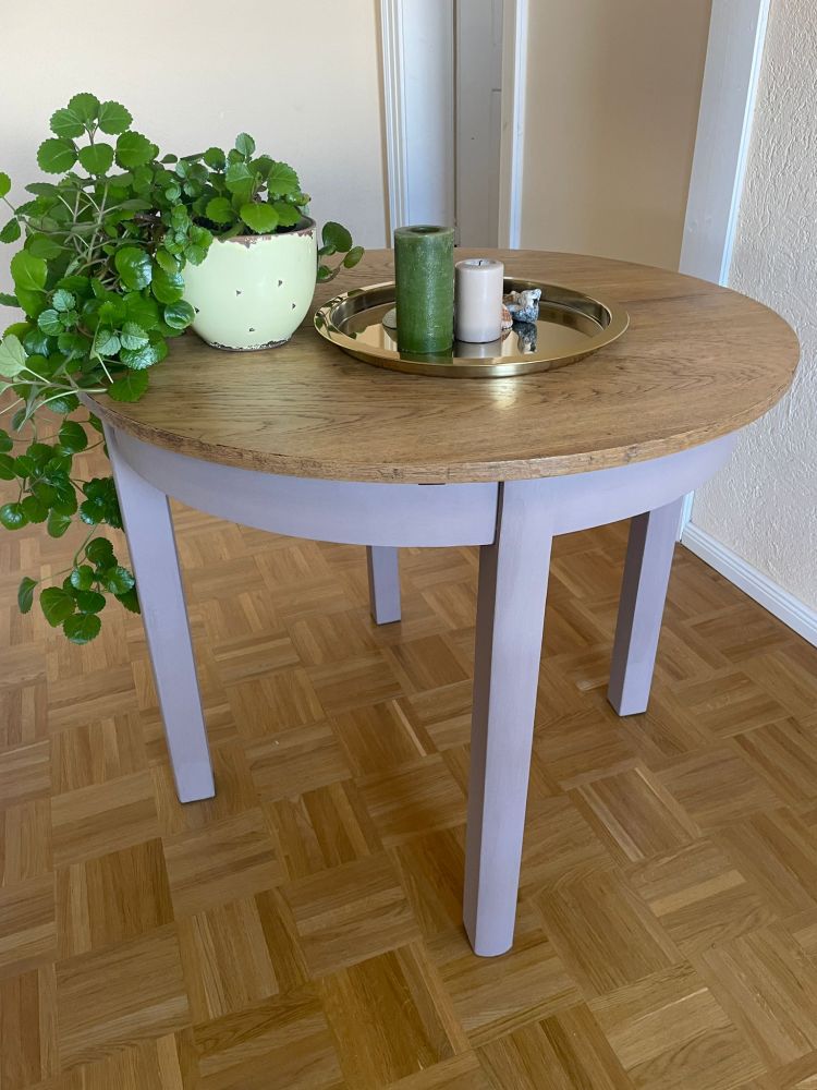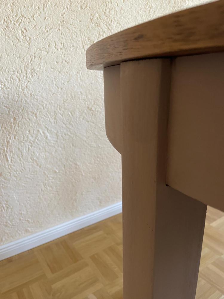 Im Rahmen der Möbelaufarbeitung wurde das Gestell mit der Kreidefarbe „Warm Grey“ von MissPompadour neu gestaltet. Der warme Grauton verleiht dem Tisch eine moderne, ruhige Ausstrahlung und betont seine klare, runde Form.
