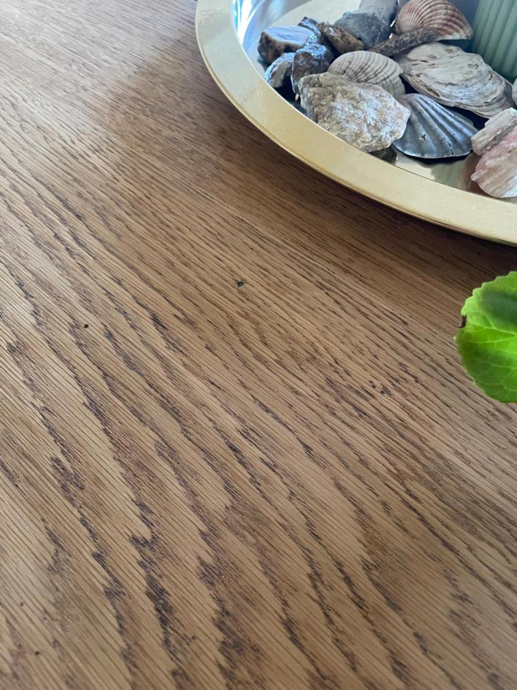 Die Tischplatte wurde sorgfältig geschliffen und mit einem matten Klarlack versiegelt. Dadurch bleibt die natürliche Holzstruktur erhalten, während die Oberfläche gleichzeitig strapazierfähig und alltagstauglich wird.
