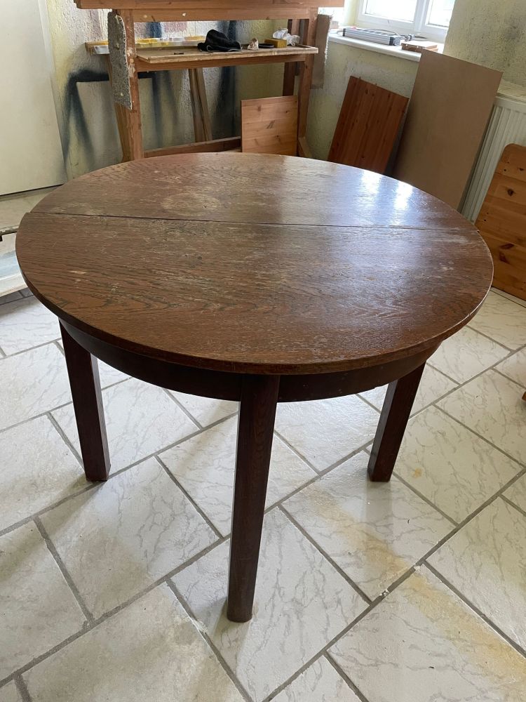 Dieser runde Vintage Tisch zeigte deutliche Gebrauchsspuren und wirkte durch seine dunkle Farbgebung optisch schwer.