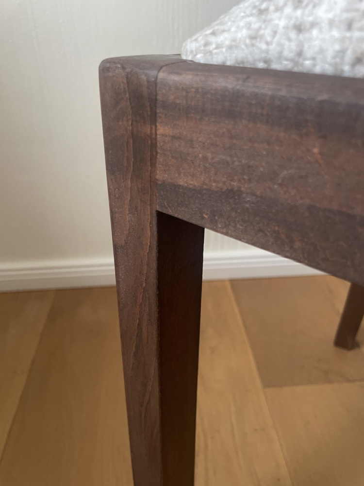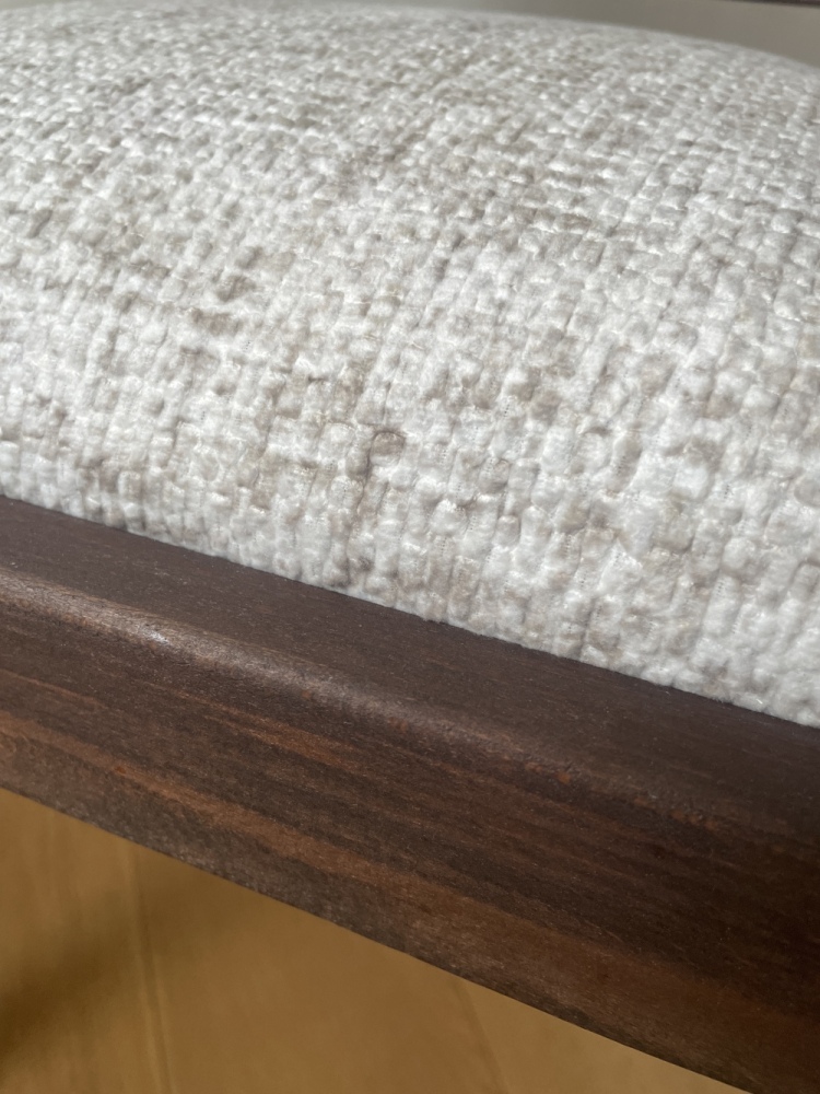 Der Stuhl erhielt eine komplett neue Polsterung und wurde mit einem hochwertigen Bouclé-Stoff bezogen, der durch seine feine Struktur und angenehme Haptik für eine moderne, elegante Anmutung sorgt. Das Holz wurde geschliffen, gebeizt und anschließend gewachst. Die bewusst matte Oberfläche unterstreicht den hochwertigen, ruhigen Charakter und lässt die Form des Stuhls für sich sprechen.